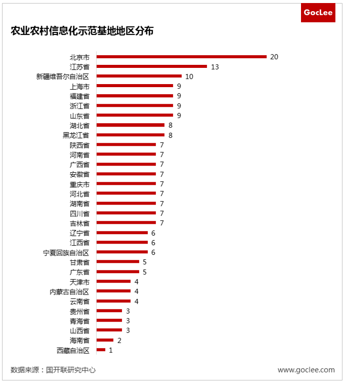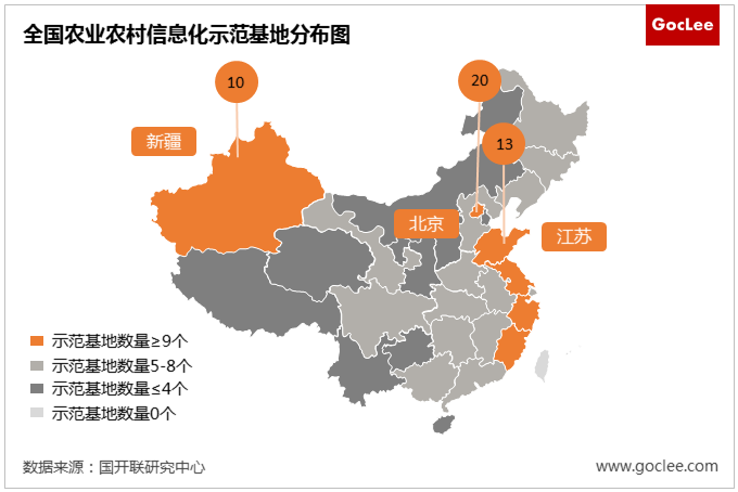 示范基地認定于2013年首次開啟,每年認定數量不斷增加。根據國開聯《農業農村信息化示范基地發展報告2021》數據顯示,2013年、2015年、2017年分別認定40、66、104個。北京憑借技術優勢擁有最多的示范基地,新疆依托產業應用優勢擁有西部地區最多的示范基地。