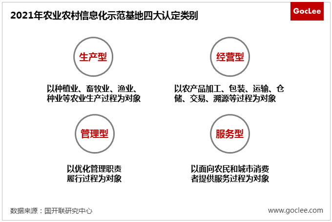 其中,在示范基地的認定類別方面做出了較大的修訂。2021年農業農村信息化示范基地認定辦法將類別調整為“生產型、經營型、管理型、服務型” 四大類別。