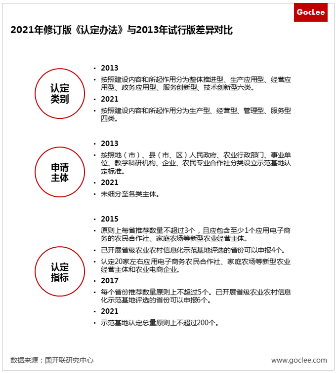 早在2013年,農業部制定了《全國農業農村信息化示范基地認定辦法(試行)》(農市發〔2013〕1號),對農業農村信息化示范基地的申報條件提出了一系列標準。根據國開聯《農業農村信息化示范基地發展報告2021》,2021年修訂版的認定辦法分別在示范基地認定類別、申請主體分類、認定指標三處進行了調整。