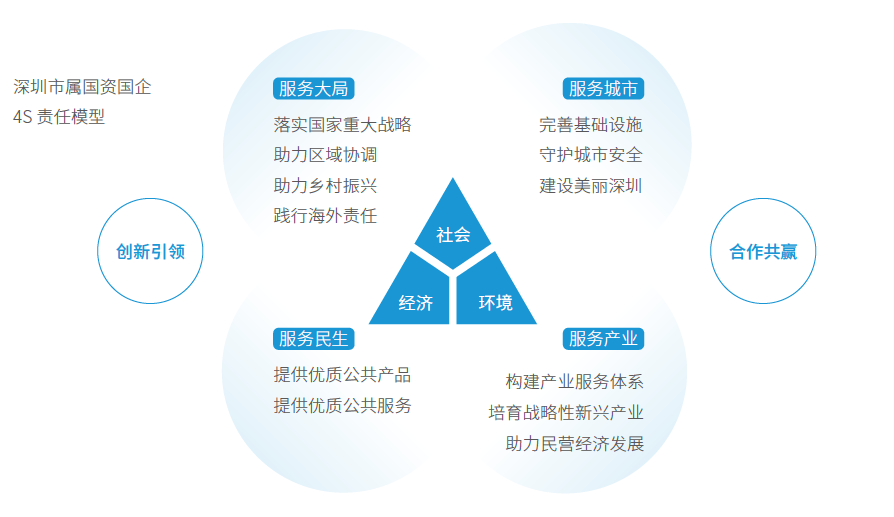 在2023年6月發(fā)布的《深圳市屬?lài)?guó)資國(guó)企2022社會(huì)責(zé)任報(bào)告》中,專(zhuān)門(mén)呈現(xiàn)了“深圳市屬?lài)?guó)資國(guó)企4S 責(zé)任模型”,對(duì)于全市國(guó)資國(guó)企履行企業(yè)社會(huì)責(zé)任提出了框架模型,是對(duì)深圳市屬?lài)?guó)資國(guó)企履行社會(huì)責(zé)任工作的根本性支撐和綱領(lǐng)性指引。
