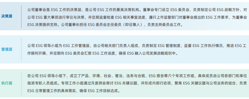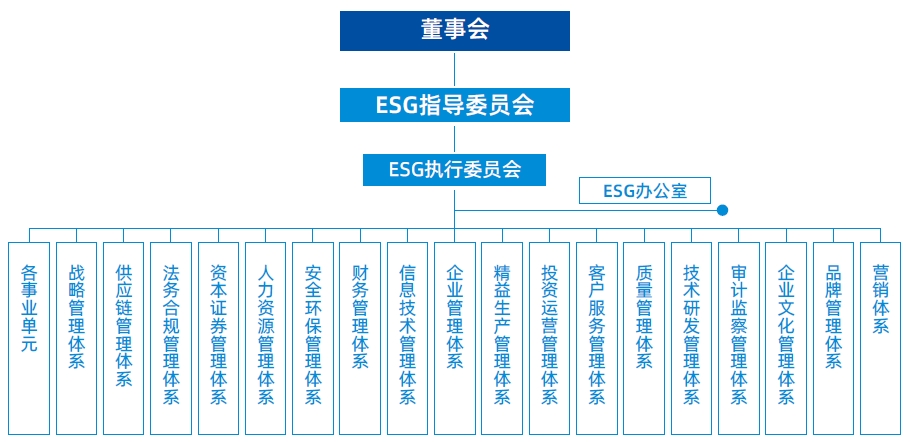 為有效保障ESG 發展規劃的落地,公司每年設定集團層面的ESG 考核目標,即MBO(Management by Objectives,MBO)。各業務部門及分子公司根據集團目標設定其自身的年度ESG 工作目標,自上而下,依次將目標分解至員工個人,最終形成了自集團管理層至普通員工均有相應的年度ESG 考核目標。相關考核目標的完成度與組織、個人的年終績效獎金直接掛鉤,充分調動公司上下各個組織單元,有效開展ESG 專項工作,確保ESG 政策方針的落實。