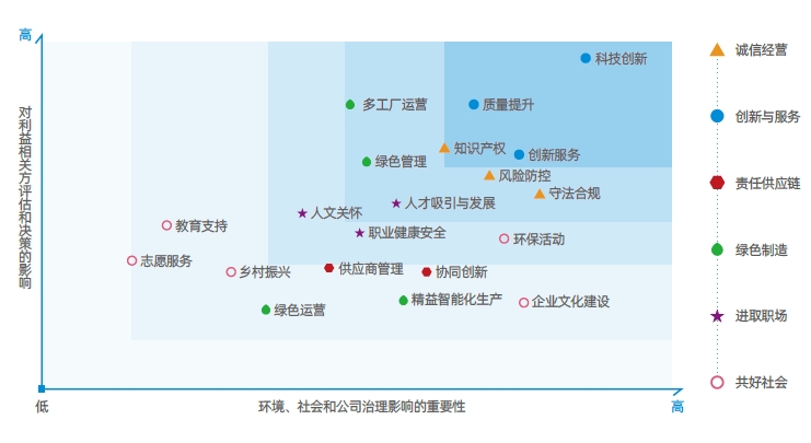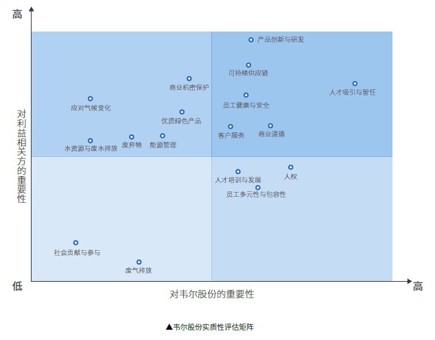 為了解利益相關方的期望與需求,提升報告的實質性,公司對報告核心議題進行篩選和分類,從外部和內部利益相關方兩個維度,識別出具有較強實質性的議題,并在報告中進行披露。