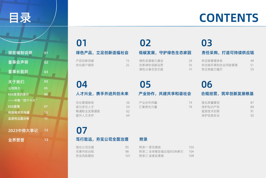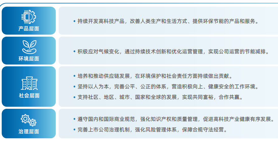 中微公司在為客戶和市場提供高科技產品和服務的同時,追求在環境保護、社會責任、公司治理等領域成為國際領先企業,立足中微七個ESG 要素的管理,推動經濟和社會可持續發展,讓人類的生活因中微而更加美好。
