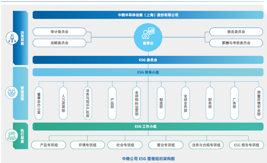 中微公司高度重視ESG 管理工作,在董事會層面專門設立了“ESG 委員會”,并建立了覆蓋“決策層- 管理層- 執行層”的三級ESG 管理架構,有條不紊地推進公司ESG 工作,提高公司ESG 管理效率,打造中微ESG 品牌形象。