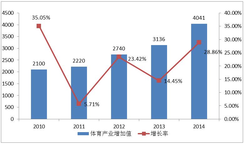 國家體育總局公布的數據顯示,我國體育及相關產業增加值占GDP的比重約為0.6%,而世界主要國家該數據約為2.0%至3.0%,可以看出整體規模相比世界主要國家該比例仍然較小。截至2014年底,中國體育產業總規模約為1.36萬億元,預計到2020年底、2025年底分別將達到3萬億元、5萬億元,年均增長速度約為14%。這組數據可見,我國在體育產業上有著較為良好的發展前景,更有提出體育產業黃金10年的說法,對于各行各業都極具吸引力。