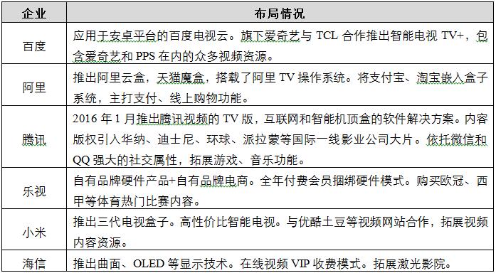 目前,智能電視領(lǐng)域主要的參與者有百度、阿里、騰訊、樂(lè)視、小米以及海信等企業(yè)。
