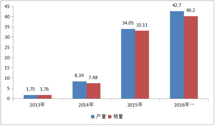 圖表 1 2013-2016年1-11月新能源產銷情況(單位:萬輛)