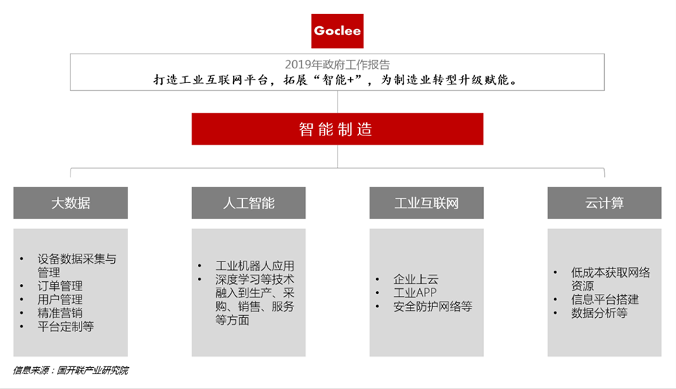 2019年政府工作報告中指出將圍繞推動制造業高質量發展,強化工業基礎和技術創新能力,促進先進制造業和現代服務業融合發展,加快建設制造強國。打造工業互聯網平臺,拓展“智能+”,為制造業轉型升級賦能。由此,“智能+”開始接棒“互聯網+”,成為國家推動傳統制造業升級轉型的新抓手,未來將成為政策關注的重點。