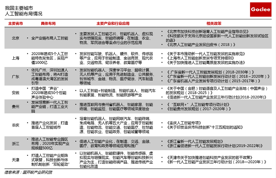由于大數據、云計算等技術在制造業企業進行智能轉型中較早應用,國內大部分城市已經開始對這兩項技術相關產業進行布局,幫助自身企業進行轉型。而對于人工智能、工業互聯網等人才基礎和產業水平要求較高的兩項技術,國內城市也開始逐步布局,北上廣深等一線城市依托龐大的人才基礎和產業優勢率先布局,福建、貴州、天津、重慶等省市緊隨其后,通過相關平臺的搭建和技術水平的不斷提升,將人工智能和工業互聯網相關技術應用在醫療、高端裝備、汽車、安防、傳感器、3D打印、通航、智慧城市等產業和領域。