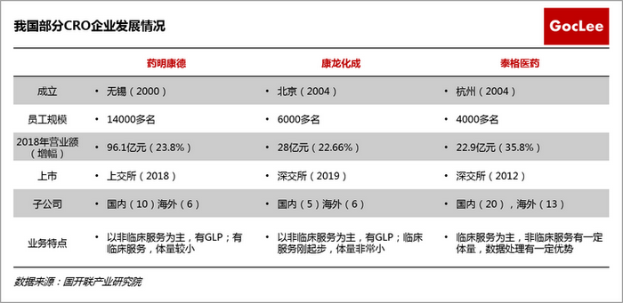 目前,我國CRO行業以藥明康德、康龍化成和泰格醫藥三大巨頭為主,隨著2019年康龍化成的上市,國內三大CRO巨頭已齊聚股票市場。近年來,CRO巨頭們積極拓展核心業務,向一站式CRO服務發展,并通過加速并購、投資的方式整合創新,擴張自己的規模。