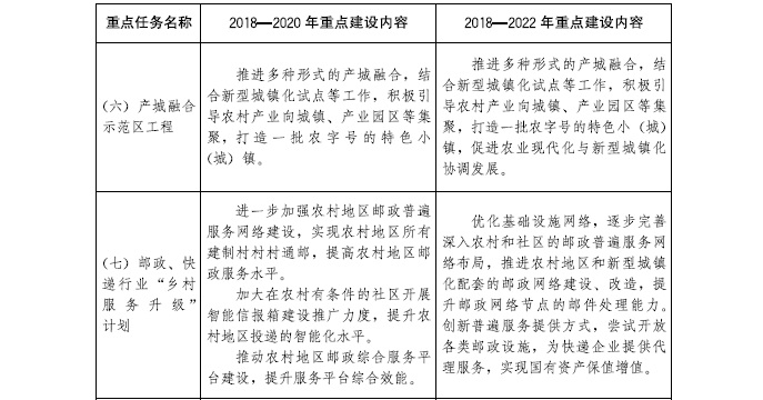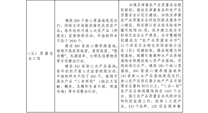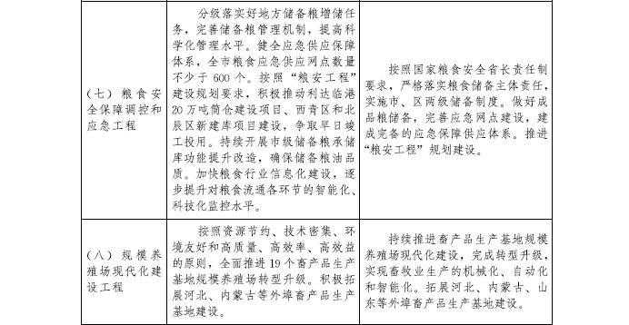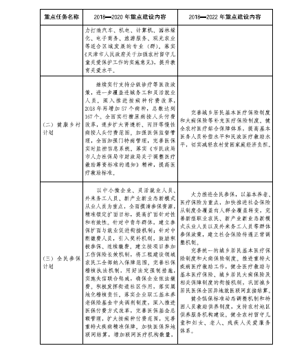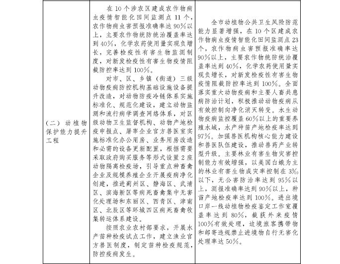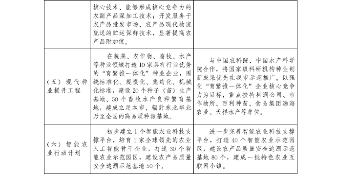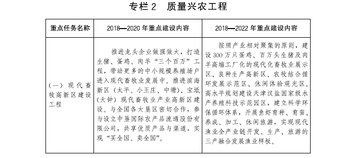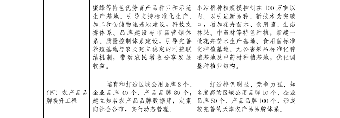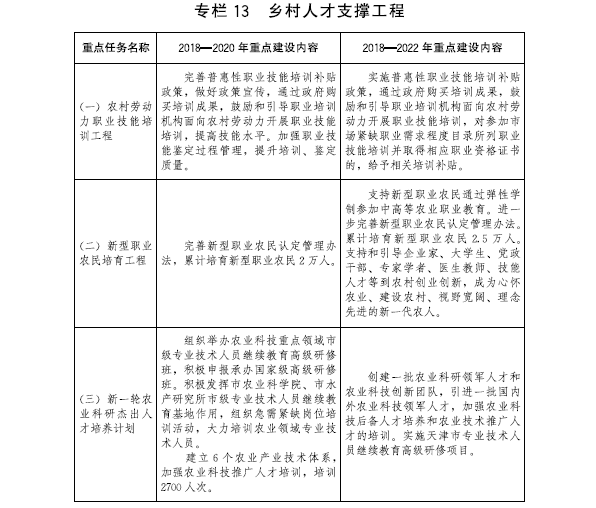 到2022年,建成農村現代產業發展體系、鄉村生態環保體系、鄉村文化體系、現代鄉村治理體系、農民民生保障體系和政策支持體系。完成優化鄉村格局建設工程、質量興農工程、農業綜合生產能力提升工程、現代農業經營體系培育工程、農村一二三產業融合發展工程、農業綠色發展工程、農村人居環境整治工程、鄉村生態保護與修復工程、鄉村文化傳承提升工程、現代鄉村治理工程、鄉村基礎設施提升工程、鄉村公共服務全覆蓋工程、鄉村人才支撐工程等“十三大工程”規劃任務。濱海新區、西青區、東麗區、北辰區和津南區等區力爭率先基本實現農業農村現代化,為全市全面實現農業農村現代化作出示范。