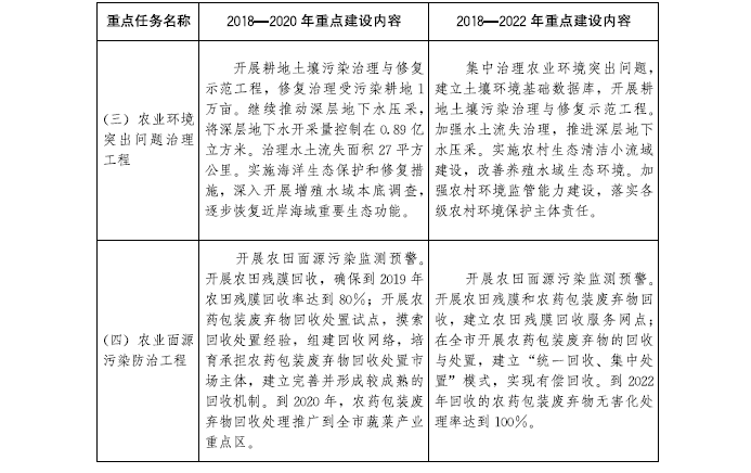 (四)集中治理農業環境突出問題。全面落實“土十條”,開展土壤污染狀況詳查,修復被污染土地。探索建立地膜生產者責任延伸制度,加大農藥包裝廢棄物回收、無害化處理和農田殘膜回收力度,消除土壤殘留。加強農村環境監管能力建設,加大執法力度,嚴禁未經達標處理的城鎮污水和其他污染物進入農業農村,嚴禁使用污水灌溉。加強農村飲用水水源地保護,嚴格控制地面沉降明顯區域的地下水開采,調整產業結構,限制高耗水產業發展。深入開展增殖水域本底調查,實施海洋生態保護和修復措施,逐步恢復近岸海域重要生態功能。