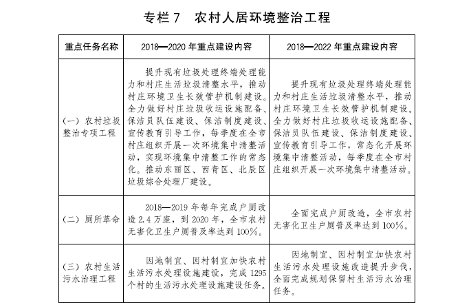 (一)加快補齊農村人居環境短板。全面推進農村全域清潔化工程,扎實推進農村人居環境整治三年行動,堅持“示范先行、以點帶面”,加快農村生活垃圾、廁所、生活污水、塑料污染治理進度。