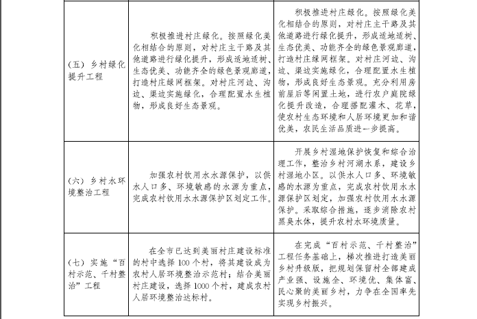 (一)建設高水平美麗村莊。依據村莊人居環境現狀分類施策,科學制定村莊發展目標。推動困難村建成美麗村莊全覆蓋,實現農村生活垃圾治理體系顯著提升、特色民居引領作用初步形成、農村人居環境干凈整潔有序的總體目標。大力推進村莊道路硬化、街道亮化、垃圾污水處理無害化、能源清潔化、綠化美化、生活健康化的基礎設施建設和農村黨員活動室、農家書屋、文化活動室、便民超市、村衛生室、村郵站的公共服務設施建設。統籌推進田、水、路、林綜合整治,改善農民生產生活條件,把美麗村莊建設與文明村鎮創建結合起來,建設特色鮮明、村容整潔、風格各異的景觀村。