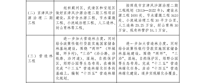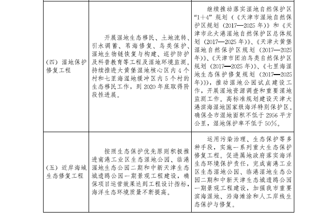 (一)健全重要生態系統保護體系。加快建設濱海新區與中心城區之間的綠色生態屏障,打造“大水、大綠、成林、成片”的“津沽綠色之洲”,發揮改善京津冀區域生態環境重要作用。完善鞏固我市防風固沙體系,繼續做好京津風沙源治理二期工程等建設工作。實施七里海等4個濕地保護與修復工程,編制重要濕地保護名錄。實施河湖休養生息制度,合理退還和保障河湖生態空間,加強對水資源涵養區、蓄滯洪區的保護。落實最嚴格的水資源管理制度,開展地下水超采區治理。加大渤海近岸綜合治理力度,恢復受損海洋生態系統。