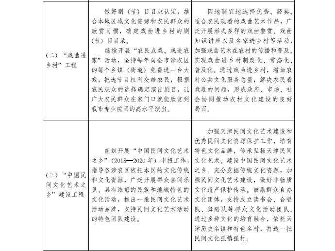 (一)保護利用鄉村傳統文化。加強非物質文化遺產保護,扶持一批農村非物質文化遺產傳承人或民間藝人。推進農村戲曲、傳統手工藝等優秀傳統文化藝術普及推廣。幫助涉農區發掘傳統文化資源,加強民間文化藝術建設,培育扶持鄉村文化骨干。