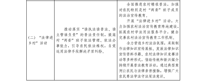 深入開展法治宣傳教育。落實“誰執法誰普法、誰主管誰負責”的普法責任制,全面推進農村精準普法,提高農民法治素養。充分發揮基層黨組織帶動作用,加強對村“兩委”班子成員法治教育,提高農村“兩委”班子法治觀念和依法管理、依法辦事能力。加快完善農業農村法規體系,保障農村改革發展穩定。健全農村公共法律服務體系,加強對農民的司法救助和法律援助,引導農民依法維權,自覺運用法律手段解決矛盾糾紛。深入開展民主法治村創建活動。