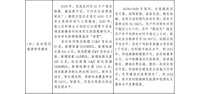 (三)構建農村現代能源體系。更新改造農村電網,全面提升農村電網供電能力和供電服務水平,扎實做好農村地區電力增容保障工作。緊密圍繞農村“煤改電”等基礎設施建設重點領域,構建全民覆蓋、城鄉一體的電力服務體系,破解城鄉電網發展建設不平衡不充分問題,徹底消除低電壓、“卡脖子”等農網瓶頸,到2020年基本實現城鄉供電一體化。加強民生用電用氣保障,按照“宜電則電、宜氣則氣”原則,穩妥有序推進冬季清潔取暖。推動太陽能、生物質能等可再生能源在農村的利用。