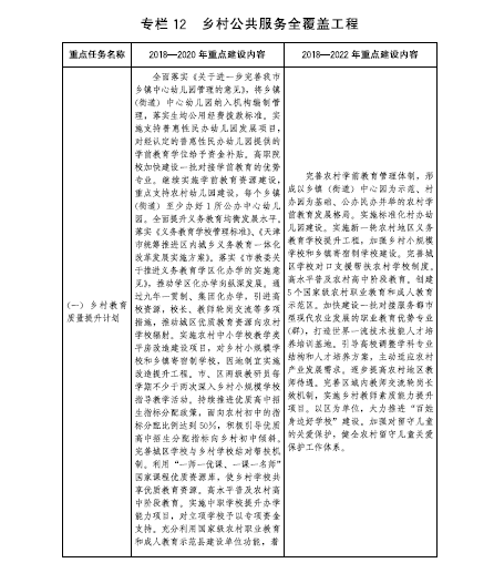 (一)優先發展農村教育事業。推動建立以城帶鄉、整體推進、城鄉一體、均衡發展的農村教育發展機制。大力推進農村學前教育資源建設,建立以政府投入為主的農村學前教育成本分擔機制,完善農村學前教育管理體制,落實學前教育五年發展計劃,每個鄉鎮(街道)至少辦好1所公辦中心幼兒園。實施新一輪農村地區義務教育學校提升工程,推進農村義務教育公辦學校現代化標準化建設,提升鄉村教育質量,促進城鄉義務教育一體化優質均衡發展。加強鄉村小規模學校和鄉鎮寄宿制學校建設。完善城區學校對口支援幫扶農村學校制度,推動城區優質教育資源向農村地區輻射。高水平普及農村高中階段教育。擴大市屬高校地方農村專項計劃規模,讓更多農村學生接受高等教育。創建5個國家級農村職業教育和成人教育示范區。利用好“一師一優課、一課一名師”國家課程優質資源庫。落實好鄉村教師支持計劃,加大高質量鄉村教師培養補充力度,建好建強鄉村教師隊伍。