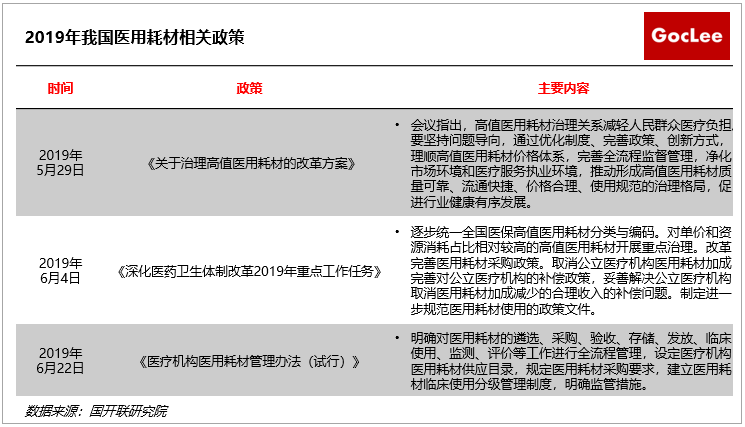 為整治上述問題,2019年5-6月國家陸續(xù)出臺《關(guān)于治理高值醫(yī)用耗材的改革方案》、《深化醫(yī)療衛(wèi)生體制改革2019年重點工作任務(wù)》和《醫(yī)療機構(gòu)醫(yī)用耗材管理辦法(試行)》三項政策針對醫(yī)療耗材進行整治,主要通過藥品耗材聯(lián)合帶量采購、取消醫(yī)用耗材加成、降低檢查檢驗費用等綜合措施,進一步規(guī)范調(diào)整醫(yī)療服務(wù)項目價格,改善醫(yī)療服務(wù)。