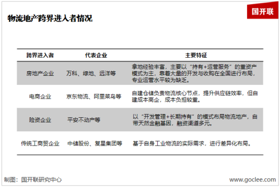 得益于良好的市場前景和可觀的投資回報率,當前除去以普洛斯、豐樹、宇培、寶灣為代表的傳統物流地產商,以ESR(易商紅木)為代表的新興勢力崛起,也有各行業企業跨界進場,以房地產開發商、電商企業、險資企業與財團、傳統工商貿企業四類代表為主,其中不乏萬科、平安不動產、京東、菜鳥等行業巨頭。