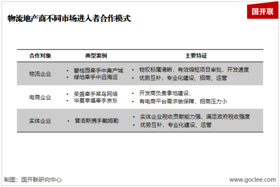 為規避給與政府純粹的物流地產印象,物流地產商各大進入者攜手合作,以政府的利益訴求為切入點,組成聯合體,其他企業以物流配套服務商出現,既能滿足政府對稅收的期待,同時也能有效使用物流地產商提供的服務,以此順利拿地。目前物流地產商已開始與物流企業、電商企業、實體企業合作,踐行這種模式。