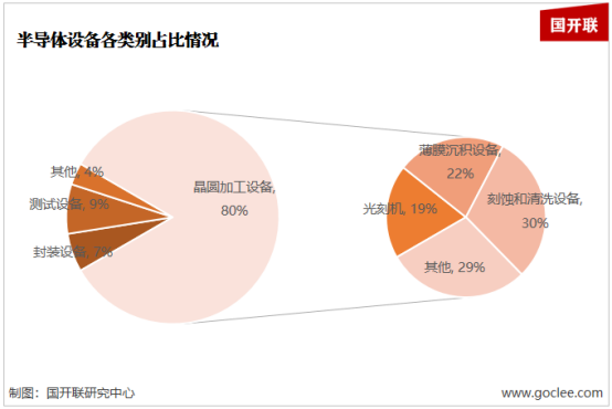 半導體設備主要分為晶圓加工設備、后道封裝設備和測試設備三類,整體市場占比呈現倒金字塔型分布,晶圓加工設備占據80%的市場,后兩者占比分別為7%和9%,而在晶圓加工設備中光刻機約占19%,薄膜沉積設備(PVD、CVD)占據22%,刻蝕和清洗設備占據30%。在技術水平較低的封裝領域,我國已經實現了國際技術水平的對接,而在技術水平高企的光刻機、刻蝕機領域,依舊被國際巨頭所寡占,如在光刻機領域,荷蘭阿斯麥爾(ASML)占據85%的市場份額,雖然我國上海微電子已經可以量產90nm的芯片,但是與阿斯麥爾在技術水平上,仍存在巨大差距。
