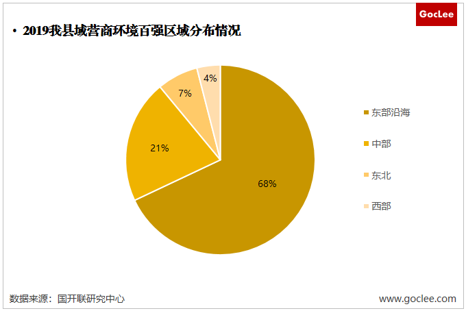 我國縣域的營商環(huán)境受區(qū)域經(jīng)濟影響較大,總體上縣域營商環(huán)境的也與我國區(qū)域經(jīng)濟發(fā)展情況相似,呈現(xiàn)東強西弱的發(fā)展態(tài)勢,區(qū)域不平衡的發(fā)展情況較為明顯。根據(jù)國家工信部,2019年我國縣域營商環(huán)境百強中,東部沿海地區(qū)憑借深厚的產(chǎn)業(yè)經(jīng)濟基礎(chǔ)和豐富的要素資源有68個縣區(qū)躋身我國縣域營商環(huán)境百強,區(qū)域先發(fā)優(yōu)勢明顯;中部以21個縣區(qū)位列第二,東北和西部分別以7個縣區(qū)和4個縣區(qū)位列第三和第四,這兩個區(qū)域的縣域營商環(huán)境亟待改善。