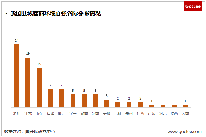 從省際分布情況來看,浙江、江蘇、山東分別以24個縣區(qū)、19個縣區(qū)和15個縣區(qū)位列前三強,在全國省市中遙遙領(lǐng)先,占據(jù)我國縣域營商環(huán)境百強的50%以上;中部地區(qū)縣域營商環(huán)境表現(xiàn)突出,在縣域營商環(huán)境百強中,湖北、湖南、河南分別占據(jù)7席、5席、5席和3席,隨著中部產(chǎn)業(yè)經(jīng)濟的崛起和營商環(huán)境的優(yōu)化,中部地區(qū)縣域營商環(huán)境水平直追東部地區(qū);西部地區(qū)僅陜西和云南入圍。