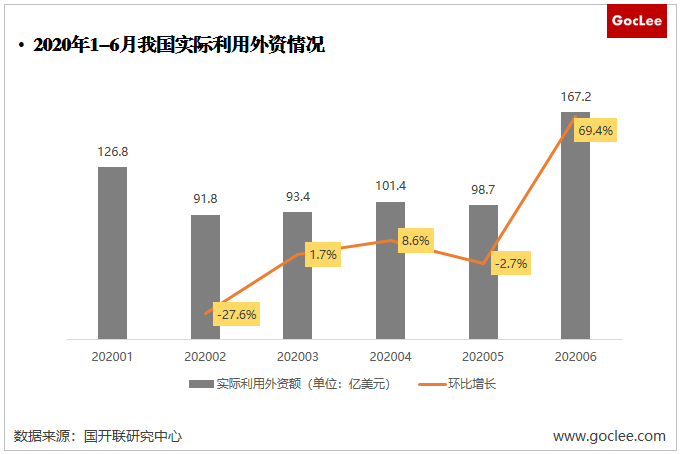 從單月增長情況來看,我國外商投資情況逐步復蘇,每月實際利用外資呈現上升趨勢,2020年6月當月我國實際利用外資達167.2億美元,相較5月增長了69.4%。外商投資與其和信心穩定趨好。