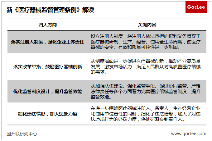 新條例將醫療器械創新納入發展重點,圍繞落實注冊人、備案人制度,強化企業主體責任、鼓勵行業創新發展、提高監管效能及違法成本四大核心要點進行修訂。