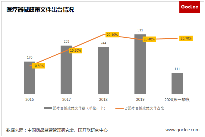 國家對醫療器械行業愈發重視。從國家和地方出臺的醫藥行業政策文件來看,2016年、2017年、2018年、2019年出臺的醫療政策文件數分別是170個、253個、244個、311個,在醫藥行業政策文件占比分別是10.5%、16.2%、22.1%、20.4%。其中,2020年僅第一季度就出臺醫療器械政策文件111個,占比20.7%,體現國家對醫療器械行業的高度重視。