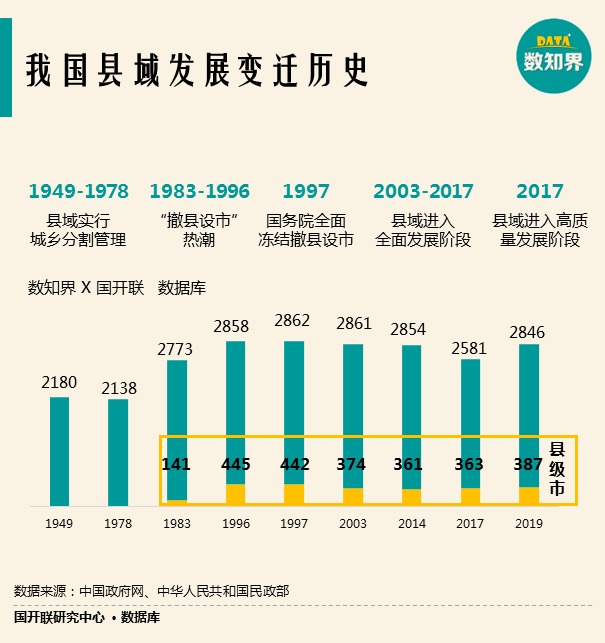 建國(guó)后,我國(guó)縣級(jí)行政區(qū)的發(fā)展也貫穿著新中國(guó)70年的歷史進(jìn)程,對(duì)我國(guó)城鄉(xiāng)發(fā)展產(chǎn)生了深遠(yuǎn)的影響。我國(guó)縣域的發(fā)展走過了城鄉(xiāng)二元分割的制度體系、以經(jīng)濟(jì)為中心快速發(fā)展,逐步轉(zhuǎn)向了全面、高質(zhì)量的發(fā)展階段。