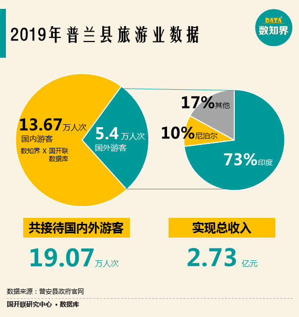 獨(dú)特的宗教意義和民俗文化也為普蘭帶來了大量的海內(nèi)外游客、教徒。也因此,旅游業(yè)成為了普蘭的支柱產(chǎn)業(yè)之一。2019年,普蘭縣共接待國(guó)內(nèi)外游客19.07萬人次,其中國(guó)內(nèi)游客13.67萬人次,國(guó)外游客5.4萬人次,實(shí)現(xiàn)總收入2.73億元。從客源地來講,國(guó)外游客中印度人占73%,尼泊爾人占10%。