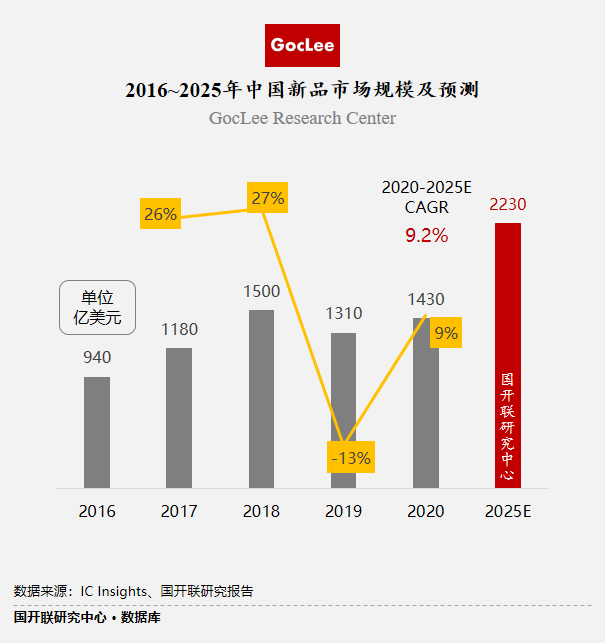 全球半導體市場強勁復蘇,中國連續多年成全球最大半導體消費市場。根據國開聯研究中心報告顯示,預計到2025年,我國半導體芯片市場規模將達到2230億美元,五年復合增長率達到9.2%。