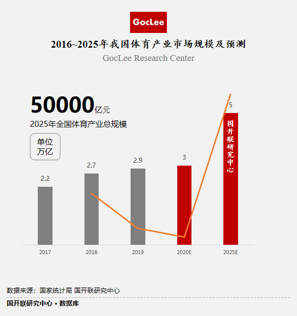 按照國開聯數據中心測算,預計2020年到2025年,我國體育產業市場規模復合增速將高達10%。