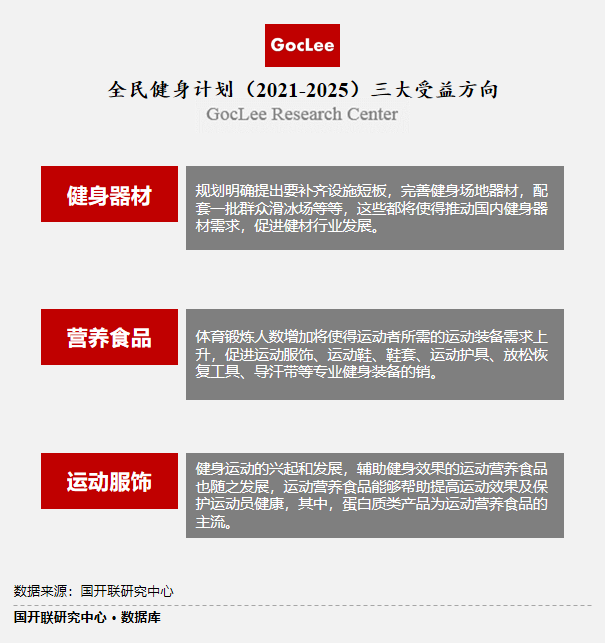 國開聯研究發現,從目前情況來看,未來健身器材、運動服飾以及營養食品將會是潛在受益方向。