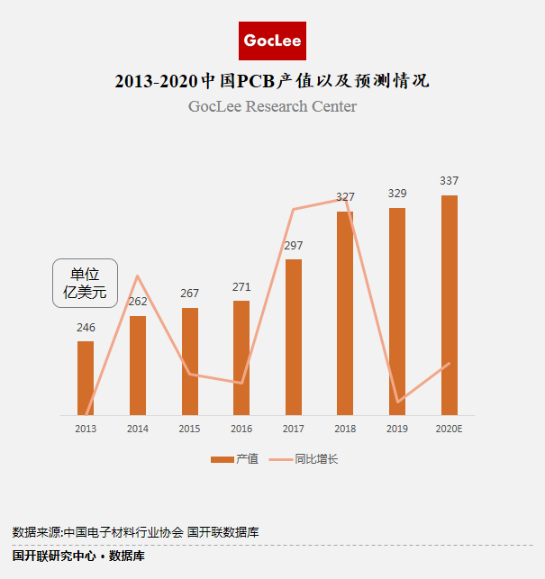 這些年來,國內的PCB產值不斷壯大,2013年整個PCB產值僅為246億美元,但是到了2019年,我國的PCB產值已經上漲了329,整體增幅達到了33.73%,增長十分迅速。