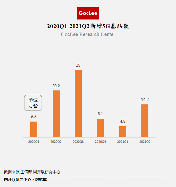 在國家政策的大力支持下,我國5G技術的研發以及建設在全球范圍內都是處于領先地位的,基站的建設也是如火如荼。2020Q1、Q2、Q3、Q4新增基站數6.8萬臺、20.2萬臺、29.0萬臺、8.1萬臺,今年Q1、Q2分別新增4.8萬臺、14.2萬臺。