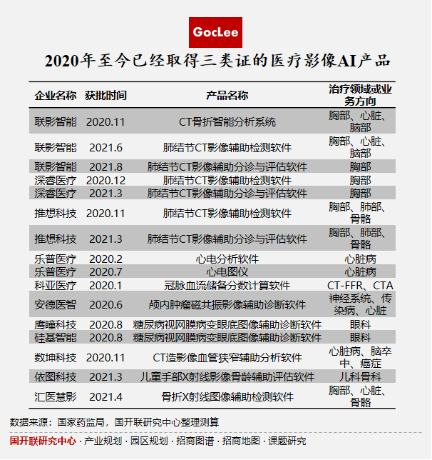 《國開聯 -第三方醫學影像中心行業報告2021》數據顯示,2020年前尚無醫學影像AI產品取得三類證,但是從2020年至今,已有11家企業的16款醫學影像AI產品取得三類證,其中不少產品的應用治療領域開始從肺結節和糖網病變向心腦血管、神經系統、骨骼甚至腫瘤等多個病種滲透,標志著醫療影像AI產品開始多元化: