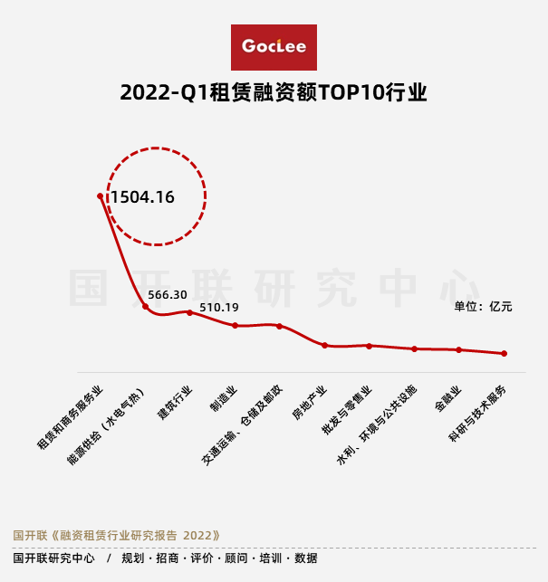 國(guó)開(kāi)聯(lián)《融資租賃行業(yè)研究報(bào)告2022》指出,2022年一季度租賃融資額最多的三個(gè)行業(yè)分別是租賃和商務(wù)服務(wù)業(yè)、電力、熱力、燃?xì)饧八a(chǎn)和供應(yīng)業(yè)和建筑業(yè)。其中,租賃和商務(wù)服務(wù)業(yè)排名第一位,融資額為1504.16億元;電力、熱力、燃?xì)饧八a(chǎn)和供應(yīng)業(yè)排名第二位,融資額為566.30億元;建筑業(yè)排名第三位,融資額為510.19億元。