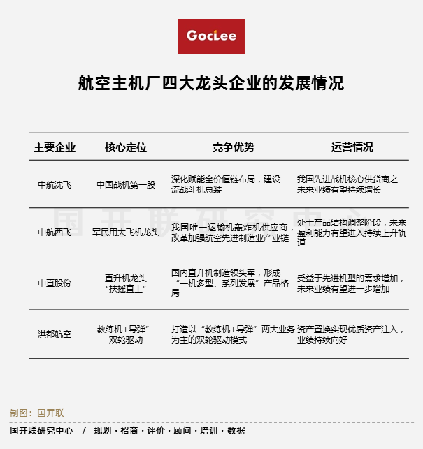 作為航空裝備產(chǎn)業(yè)鏈最核心的下游,四大主機(jī)廠龍頭企業(yè)將繼續(xù)引領(lǐng)產(chǎn)業(yè)鏈成長(zhǎng)的強(qiáng)勁力量,隨著中央扶持加大,四大平臺(tái)也將成為國(guó)內(nèi)航空裝備的重要支撐,保障國(guó)防安全,同時(shí)也引領(lǐng)航空設(shè)備制造業(yè)提質(zhì)升級(jí),實(shí)現(xiàn)高質(zhì)量可持續(xù)發(fā)展,發(fā)揮航空裝備主航向作用。