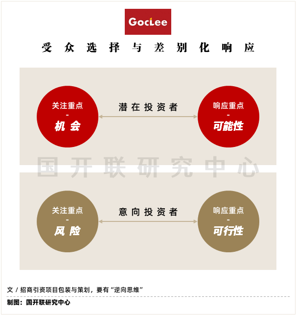 國(guó)開聯(lián)招商引資專業(yè)服務(wù)團(tuán)隊(duì)表示,因?yàn)閷?duì)接階段的差異,這兩類群體的核心訴求也必然存在較大的差異,總體而言,“潛在投資者”關(guān)注更多的在“機(jī)會(huì)”,而“意向投資者”關(guān)注更多的在“風(fēng)險(xiǎn)”。我們?cè)诎b策劃招商引資項(xiàng)目的時(shí)候,面向“潛在投資者”則應(yīng)重點(diǎn)圍繞投資的“可能性”來進(jìn)行呼應(yīng),面向“意向投資者”則應(yīng)重點(diǎn)圍繞落地的“可行性”來進(jìn)行呼應(yīng)。