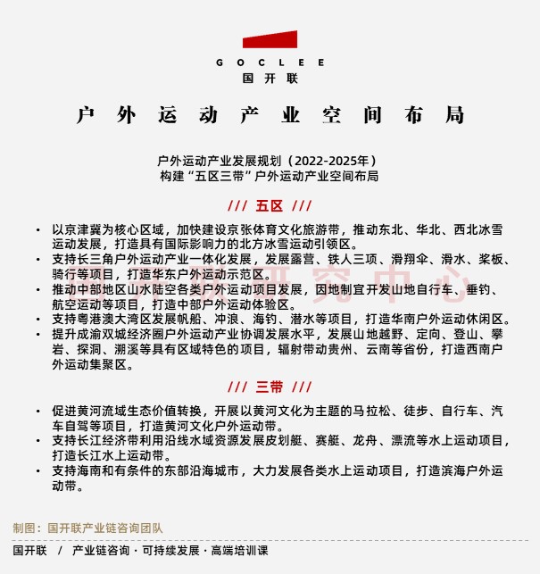 一是針對“全國戶外運動產業發展格局”方面,明確了“構建“五區三帶”戶外運動產業空間布局”的計劃;