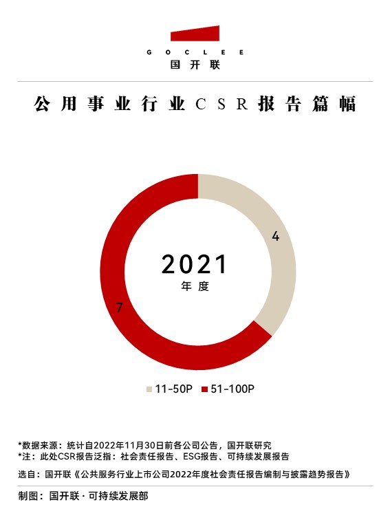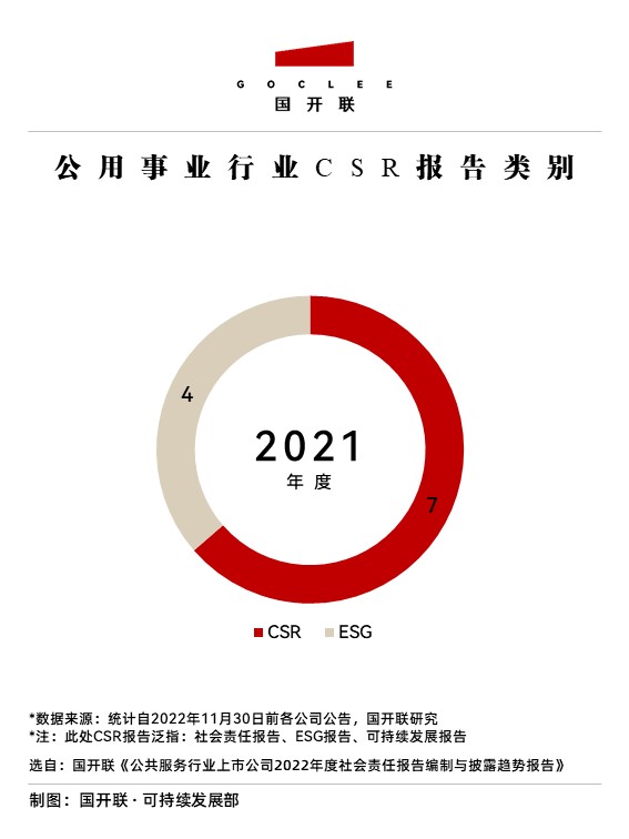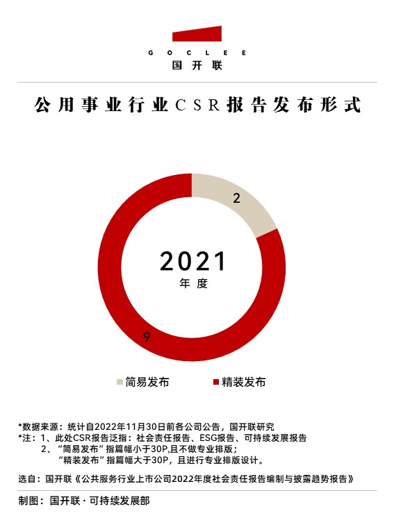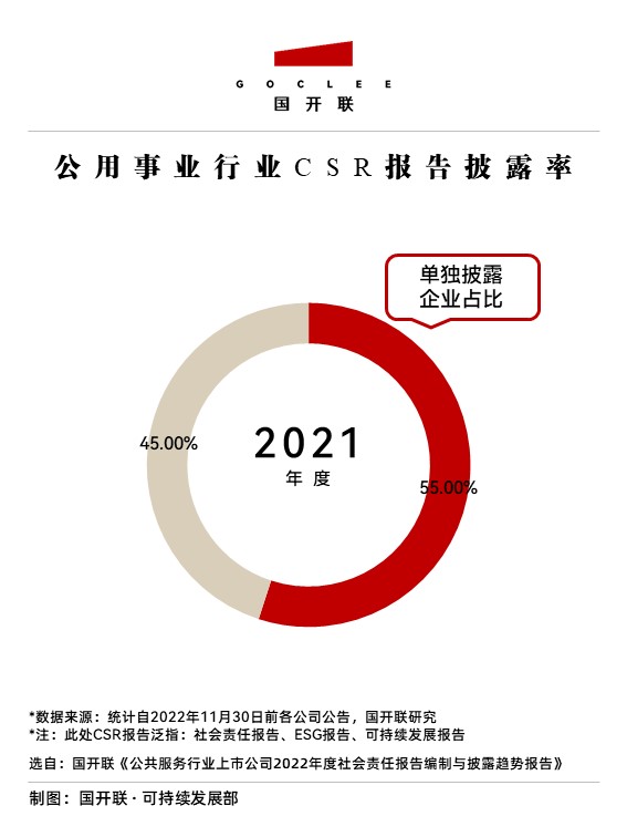 根據國開聯發布的《公共服務行業A股上市公司2022年度社會責任報告編制與披露趨勢》報告數據顯示,2021年度公用事業版塊A股上市中獨立披露社會責任報告(CSR)和ESG報告的企業數達11家,占該版塊全部上市公司的55%。