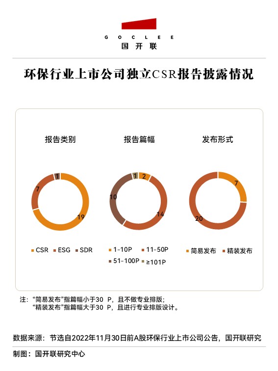環保行業2021年度獨立披露社會責任報告(CSR)、ESG報告和可持續發展報告(SDR)的披露率為24%,共有27家企業單獨披露相關報告,報告篇幅方面一半超過50P,且多數通過專業設計排版后精裝發布。