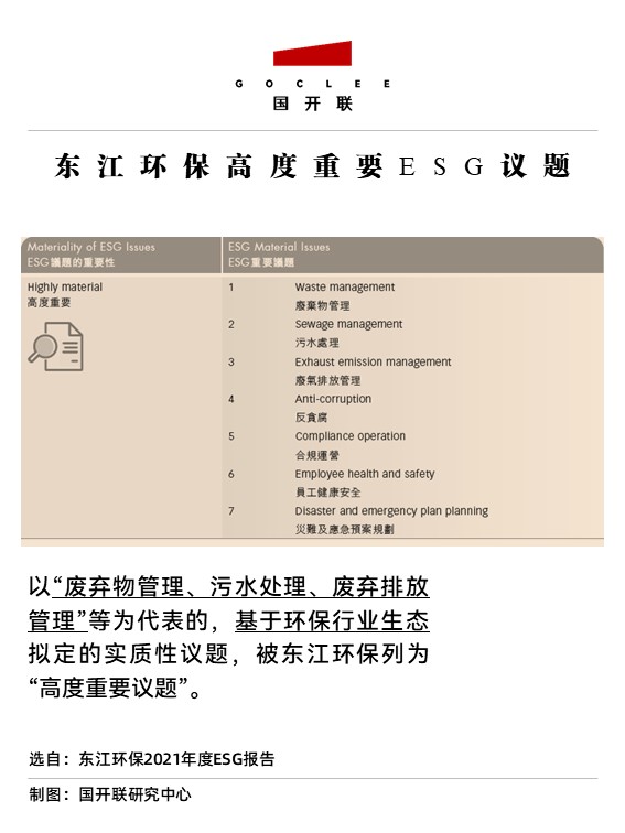 從東江環保2021年度ESG報告中擬定的實質性議題來看,東江環保將“廢棄物管理、污水處理、廢棄排放管理”等基于環保行業生態導向性議題,列為了“高度重要議題”。