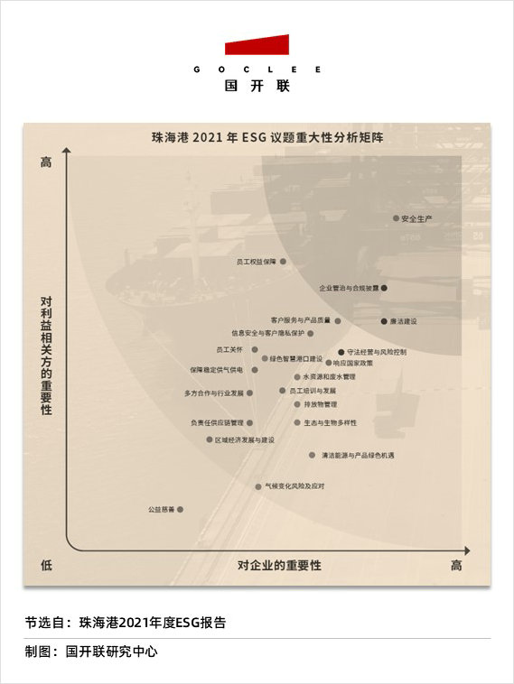 2021年度,珠海港獨立披露了環境、社會及管治報告(ESG),內容體系完善,設計排版精美,尤其在可持續發展議題體系的搭建上,基于航運港口行業生態做出了相對系統性的安排。