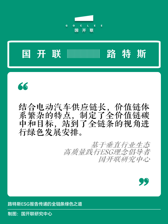國開聯(lián)可持續(xù)發(fā)展團(tuán)隊研究發(fā)現(xiàn),路特斯披露的ESG報告除了介紹路特斯科技ESG戰(zhàn)略、梳理2022年在履行環(huán)境責(zé)任、創(chuàng)造社會價值及提升公司治理方面所取得的成就等常規(guī)信息外,在路特斯ESG報告中,所傳遞出來的是路特斯針對企業(yè)所處全價值鏈的綠色發(fā)展所做出的戰(zhàn)略安排。